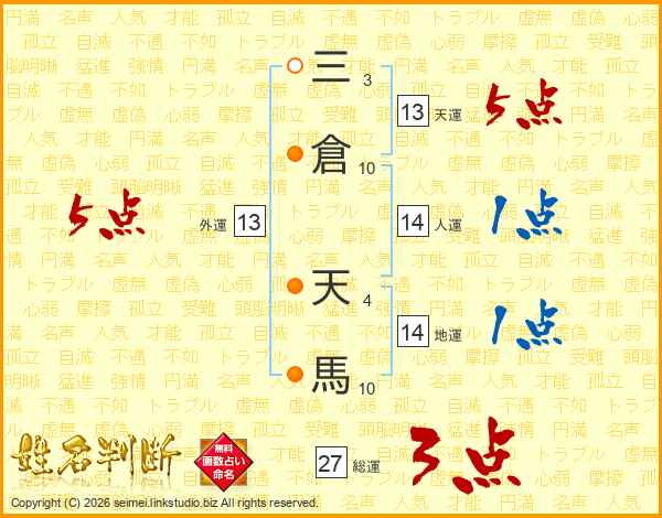 生活面を象徴する運勢です。外部から受ける影響力を表し、結婚運、家庭運や職場、環境への順応性を表します。総運から人運を引いた画数。姓や名が1文字の場合を除く。
