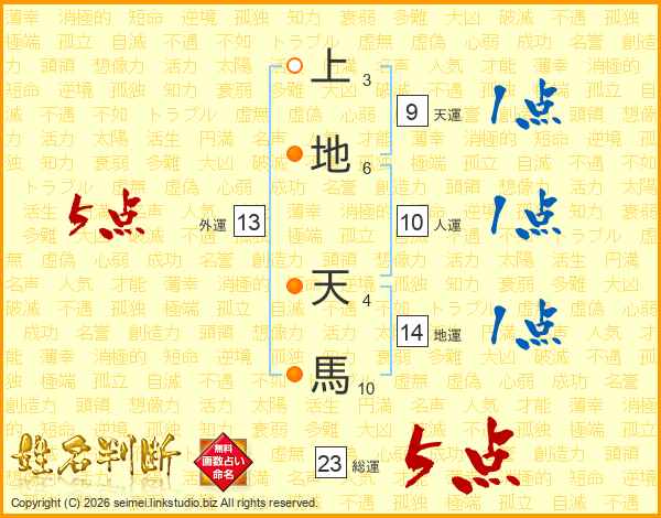 生活面を象徴する運勢です。外部から受ける影響力を表し、結婚運、家庭運や職場、環境への順応性を表します。総運から人運を引いた画数。姓や名が1文字の場合を除く。