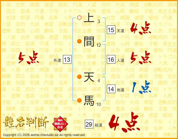 生活面を象徴する運勢です。外部から受ける影響力を表し、結婚運、家庭運や職場、環境への順応性を表します。総運から人運を引いた画数。姓や名が1文字の場合を除く。