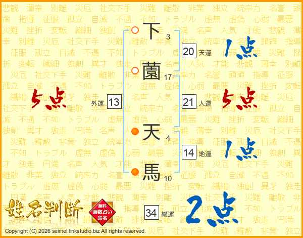 生活面を象徴する運勢です。外部から受ける影響力を表し、結婚運、家庭運や職場、環境への順応性を表します。総運から人運を引いた画数。姓や名が1文字の場合を除く。