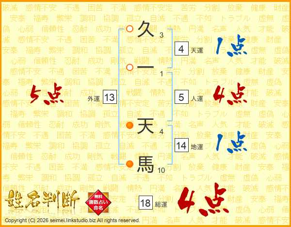 生活面を象徴する運勢です。外部から受ける影響力を表し、結婚運、家庭運や職場、環境への順応性を表します。総運から人運を引いた画数。姓や名が1文字の場合を除く。