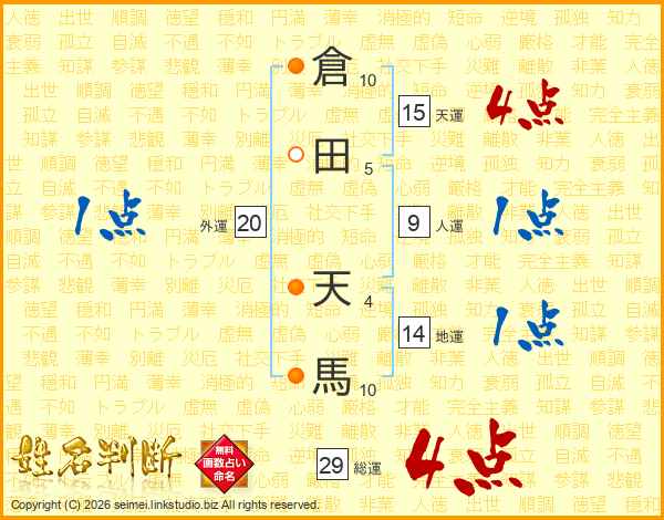 倉田天馬さんの総運は29画の4点!