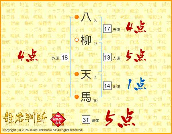 八柳天馬さんの総運は31画の5点!