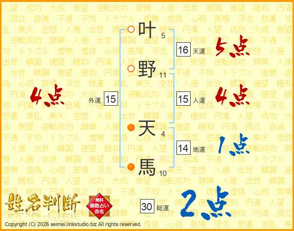生活面を象徴する運勢です。外部から受ける影響力を表し、結婚運、家庭運や職場、環境への順応性を表します。総運から人運を引いた画数。姓や名が1文字の場合を除く。