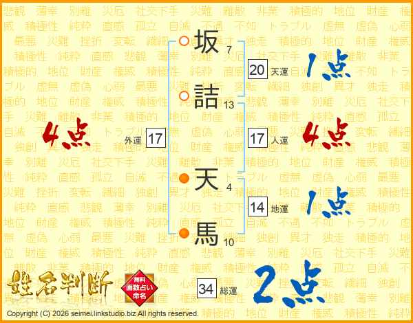 坂(7画)詰(13画) 天(4画)馬(10画)
