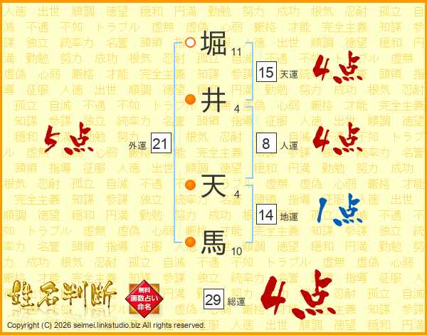 堀(11画)井(4画) 天(4画)馬(10画)