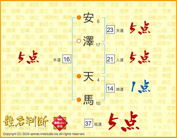 生活面を象徴する運勢です。外部から受ける影響力を表し、結婚運、家庭運や職場、環境への順応性を表します。総運から人運を引いた画数。姓や名が1文字の場合を除く。