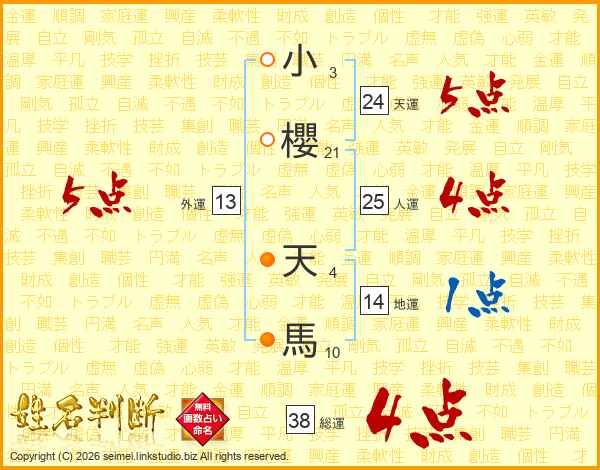 小櫻天馬さんの総運は38画の4点!