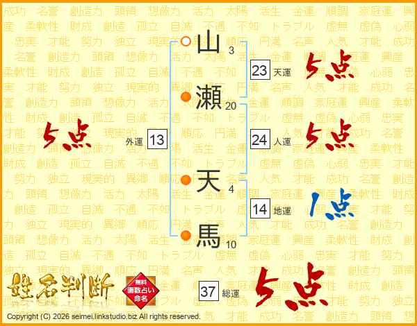 山(3画)瀬(20画) 天(4画)馬(10画)