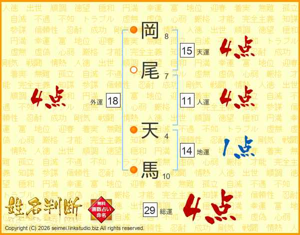 岡(8画)尾(7画) 天(4画)馬(10画)