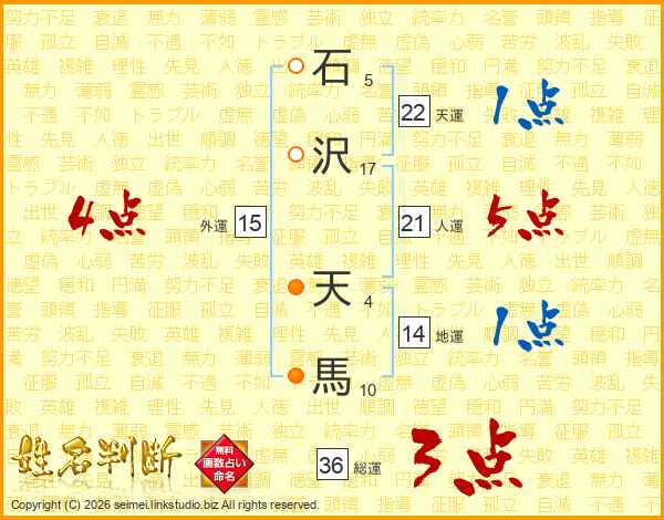 生活面を象徴する運勢です。外部から受ける影響力を表し、結婚運、家庭運や職場、環境への順応性を表します。総運から人運を引いた画数。姓や名が1文字の場合を除く。