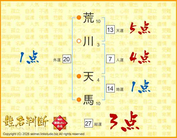 生活面を象徴する運勢です。外部から受ける影響力を表し、結婚運、家庭運や職場、環境への順応性を表します。総運から人運を引いた画数。姓や名が1文字の場合を除く。