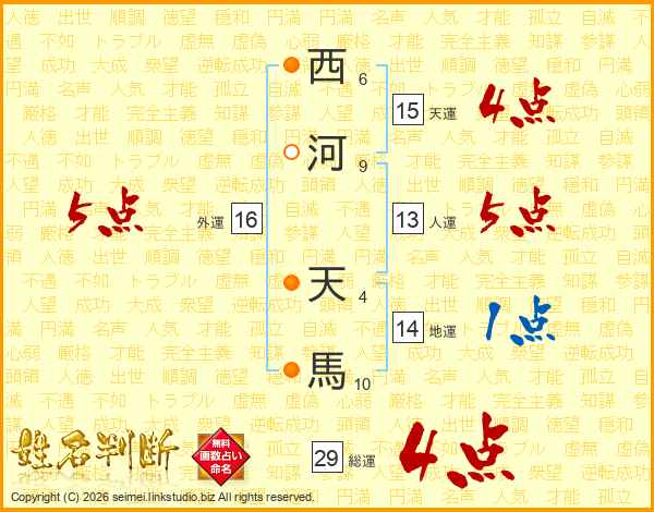 生活面を象徴する運勢です。外部から受ける影響力を表し、結婚運、家庭運や職場、環境への順応性を表します。総運から人運を引いた画数。姓や名が1文字の場合を除く。