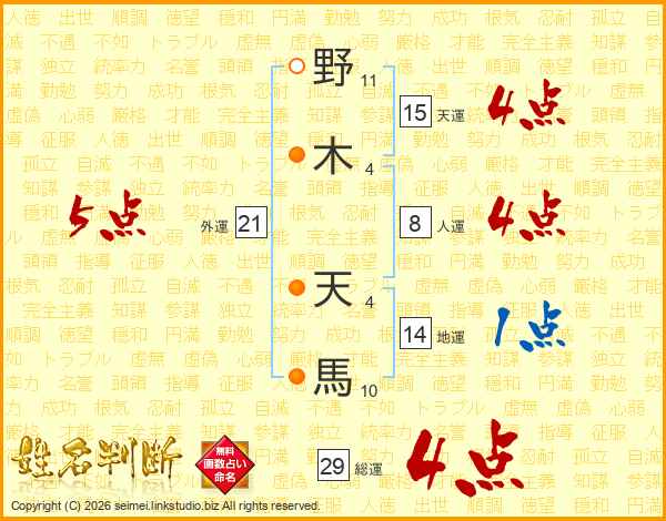 野木天馬さんの総運は29画の4点!