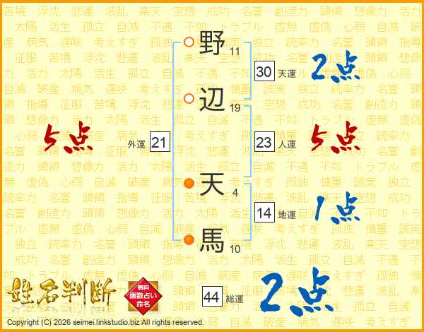 生活面を象徴する運勢です。外部から受ける影響力を表し、結婚運、家庭運や職場、環境への順応性を表します。総運から人運を引いた画数。姓や名が1文字の場合を除く。