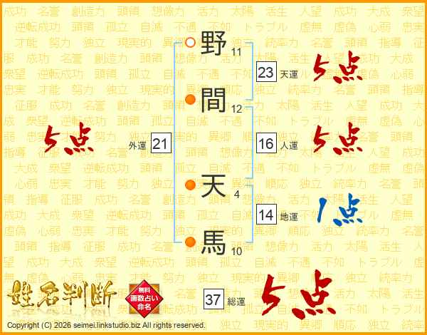 生活面を象徴する運勢です。外部から受ける影響力を表し、結婚運、家庭運や職場、環境への順応性を表します。総運から人運を引いた画数。姓や名が1文字の場合を除く。