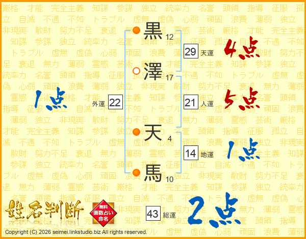 黒澤天馬さんの天運は29画の4点!