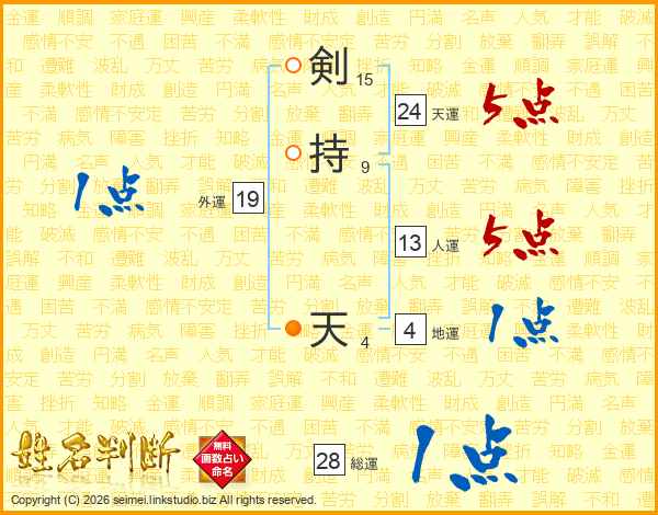 剣(15画)持(9画) 天(4画)