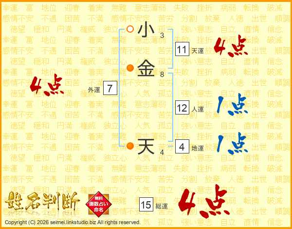 生活面を象徴する運勢です。外部から受ける影響力を表し、結婚運、家庭運や職場、環境への順応性を表します。総運から人運を引いた画数。姓や名が1文字の場合を除く。