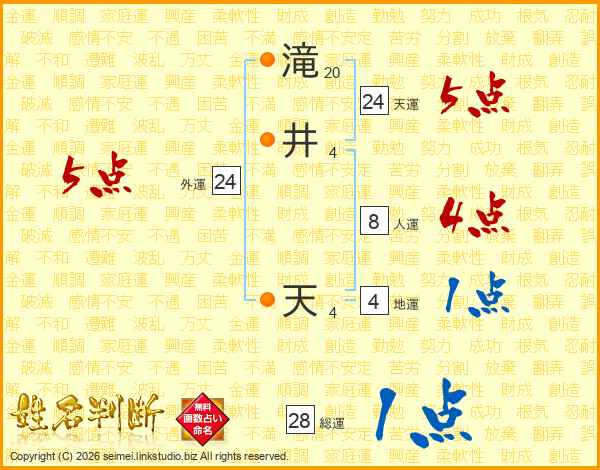 生活面を象徴する運勢です。外部から受ける影響力を表し、結婚運、家庭運や職場、環境への順応性を表します。総運から人運を引いた画数。姓や名が1文字の場合を除く。