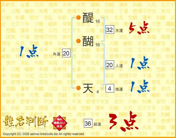 生活面を象徴する運勢です。外部から受ける影響力を表し、結婚運、家庭運や職場、環境への順応性を表します。総運から人運を引いた画数。姓や名が1文字の場合を除く。