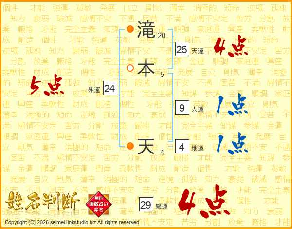 あなたの人生を表す1番重要な運勢です。生涯を通じて影響する総合運となり、主に50歳以降の晩年期に影響を及ぼします。苗字と名前の合計画数。