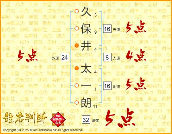 久(3画)保(9画)井(4画) 太(4画)一(1画)朗(11画)
