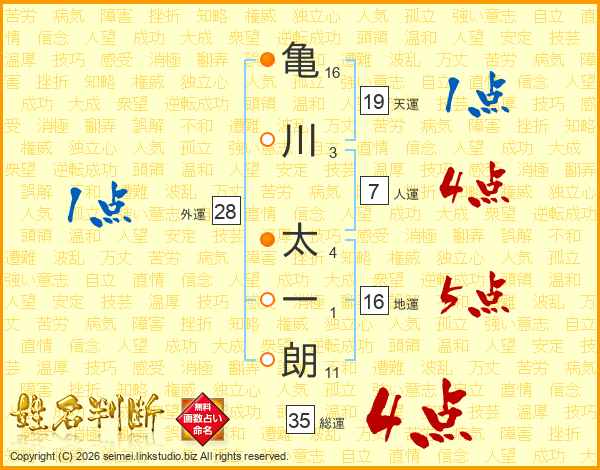 亀(16画)川(3画) 太(4画)一(1画)朗(11画)
