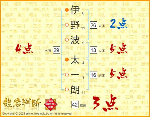 伊(6画)野(11画)波(9画) 太(4画)一(1画)朗(11画)