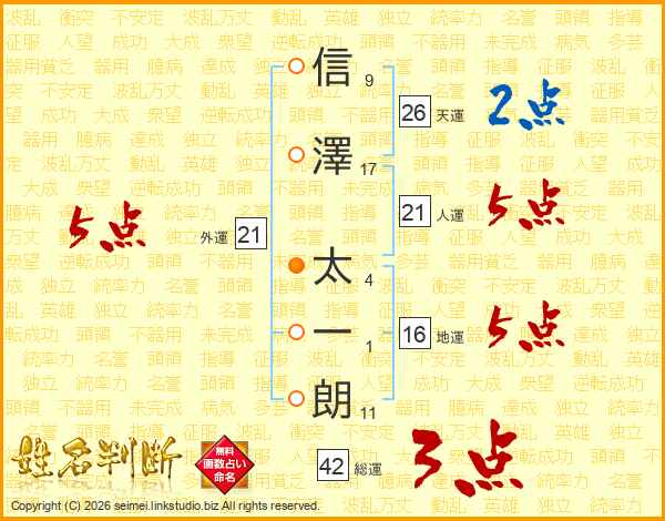 信(9画)澤(17画) 太(4画)一(1画)朗(11画)