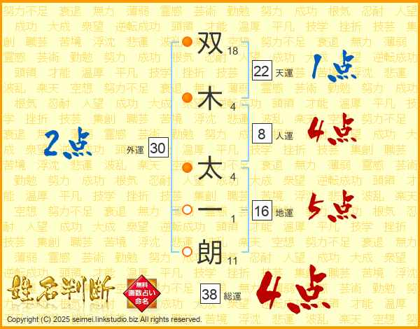 双(18画)木(4画) 太(4画)一(1画)朗(11画)