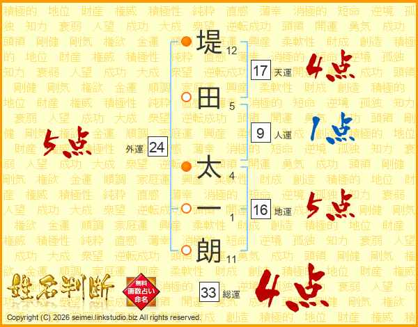 堤田太一朗さんの総運は33画の4点!