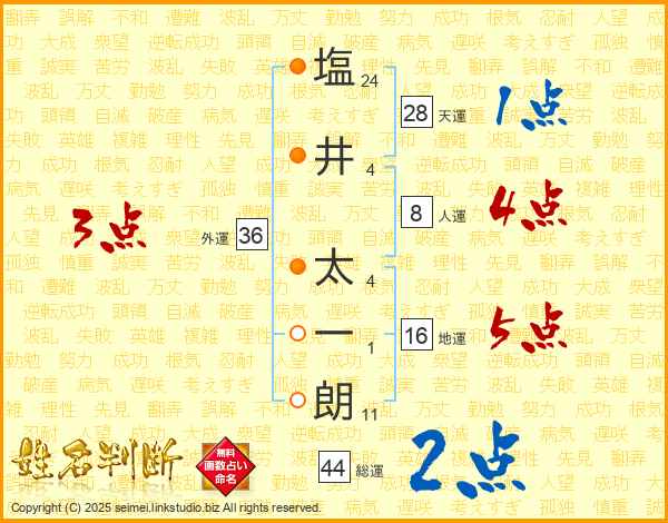 塩(24画)井(4画) 太(4画)一(1画)朗(11画)
