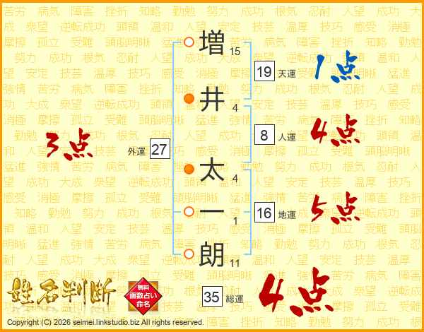 増(15画)井(4画) 太(4画)一(1画)朗(11画)