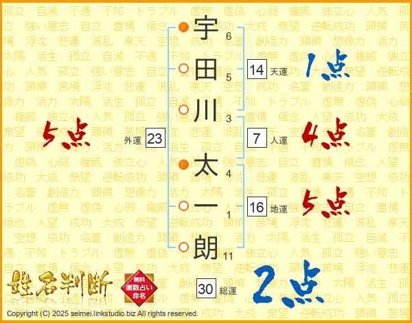 宇(6画)田(5画)川(3画) 太(4画)一(1画)朗(11画)