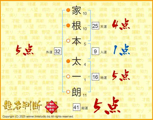 家(10画)根(10画)本(5画) 太(4画)一(1画)朗(11画)
