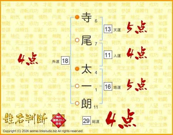 寺(6画)尾(7画) 太(4画)一(1画)朗(11画)