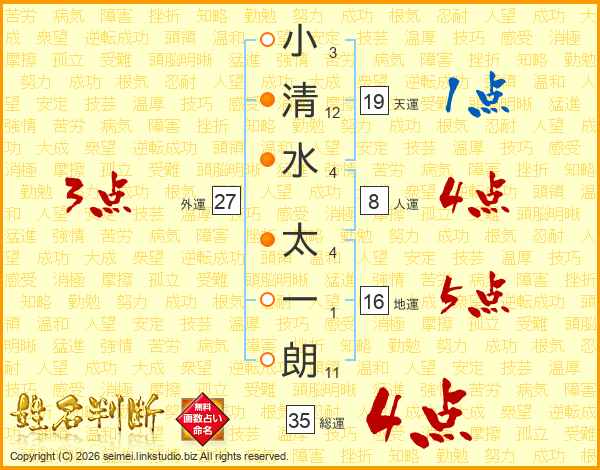 小(3画)清(12画)水(4画) 太(4画)一(1画)朗(11画)