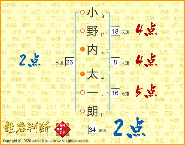 小(3画)野(11画)内(4画) 太(4画)一(1画)朗(11画)