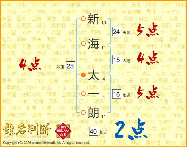 新(13画)海(11画) 太(4画)一(1画)朗(11画)