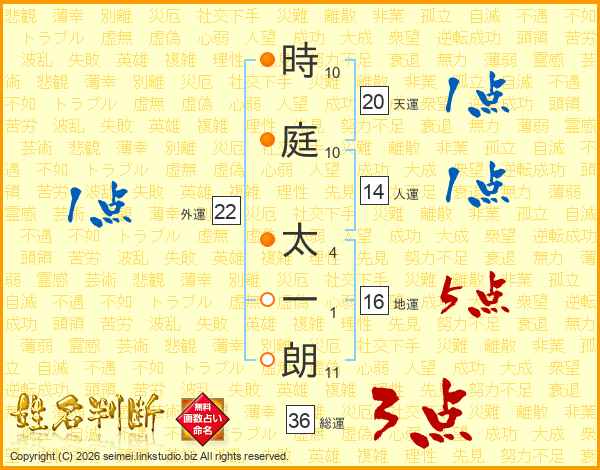 時(10画)庭(10画) 太(4画)一(1画)朗(11画)