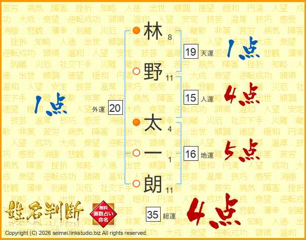 林(8画)野(11画) 太(4画)一(1画)朗(11画)