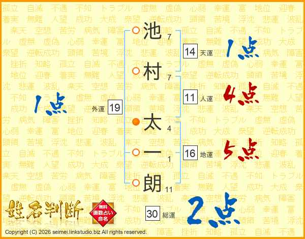 池(7画)村(7画) 太(4画)一(1画)朗(11画)