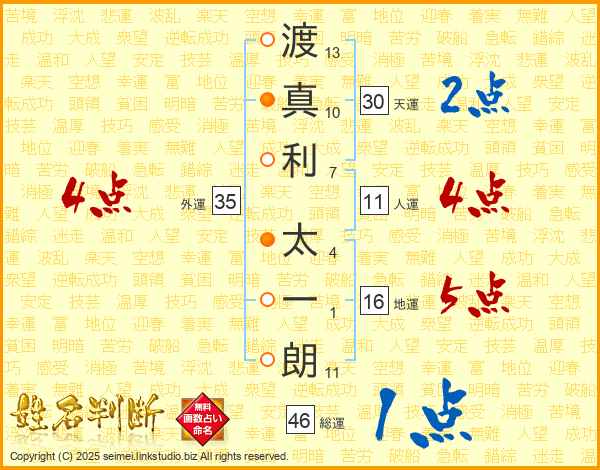 渡(13画)真(10画)利(7画) 太(4画)一(1画)朗(11画)
