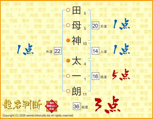 田(5画)母(5画)神(10画) 太(4画)一(1画)朗(11画)