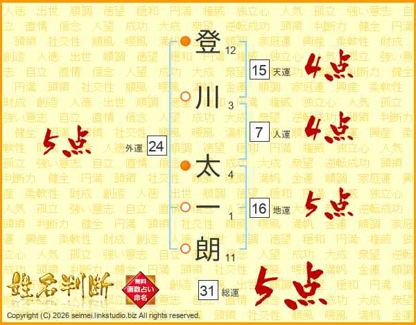 登(12画)川(3画) 太(4画)一(1画)朗(11画)