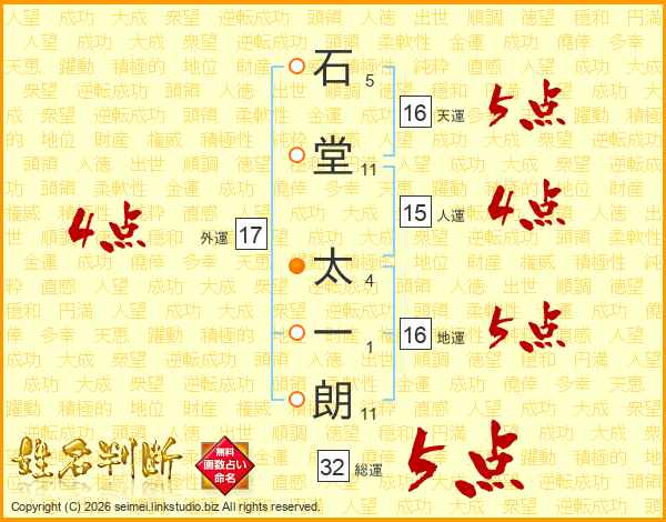 石(5画)堂(11画) 太(4画)一(1画)朗(11画)