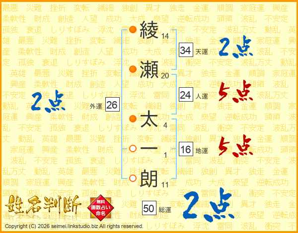 綾瀬太一朗さんの総運は50画の2点!
