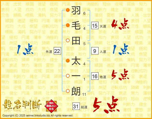 羽毛田太一朗さんの総運は31画の5点!