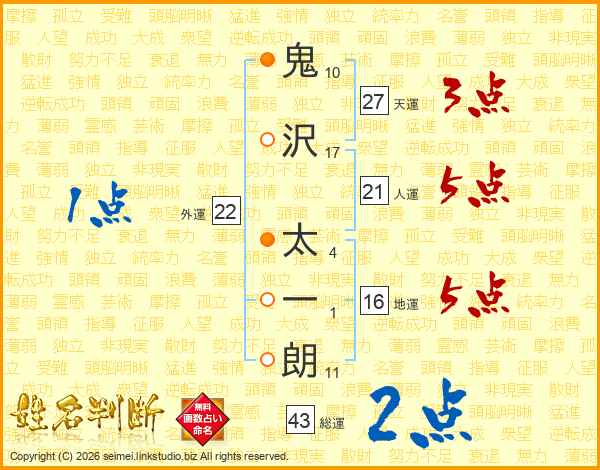 鬼(10画)沢(17画) 太(4画)一(1画)朗(11画)